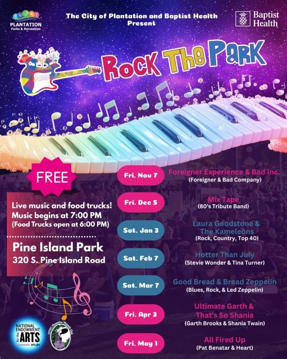 Plantation is rocking out with free Rock The Park outdoor events that include live bands and food trucks. Events are usually first Fridays and sometimes first Saturdays, at Pine Island Park, with food vendors set up at 6 p.m. and entertainment at 7 p.m. and entry is free. Featured bands in 2026 include: Saturday, February […]